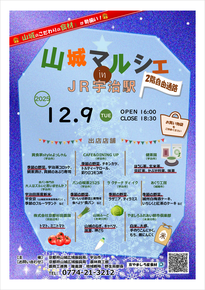 京都府山城広域振興局と宇治市では、京やましろ産の季節の野菜や加工品等を地域の皆さまに広く紹介し、身近に親しんでいただくため、多くの人が通られるJR宇治駅2階自由通路(改札前)にて、「山城マルシェ」を開催されます。