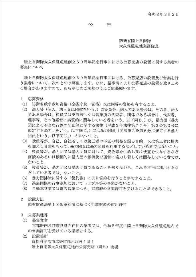 陸上自衛隊大久保駐屯地創立69周年記念行事における、公募売店の設置及び営業を行う業者について、下記のとおり募集されています。
