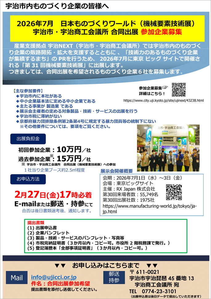 産業支援拠点宇治NEXT(宇治市・宇治商工会議所)では宇治市内のものづくり企業の販路開拓・拡大を支援するとともに、「技術力のあるものづくり企業が集積するまち」のPRを行うため、 2026年 7月に東京ビッグサイトで開催される「第31回機械要素技術展」に出展します。