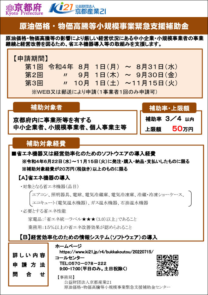 京都産業21では、原油価格・物価高騰等の影響により厳しい経営状況にある中小企業・小規模事業者の事業継続と経営改善を図るため、省エネ機器導入等の取り組みを支援する「原油価格・物価高騰等小規模事業緊急支援補助金」の募集を8月1日から開始されます。