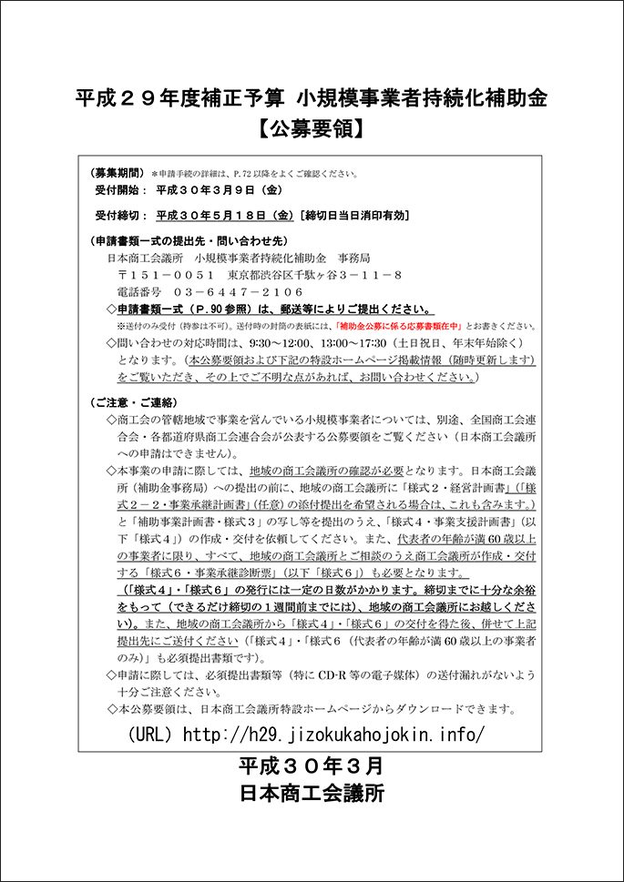 2月1日に国会で可決した平成29年度補正予算により、日本商工会議所では、経営の持続化を図る取り組みを支援し、地域の原動力となる小規模事業者の活性化を図るため、「小規模事業者持続化補助金」の募集を開始しています。