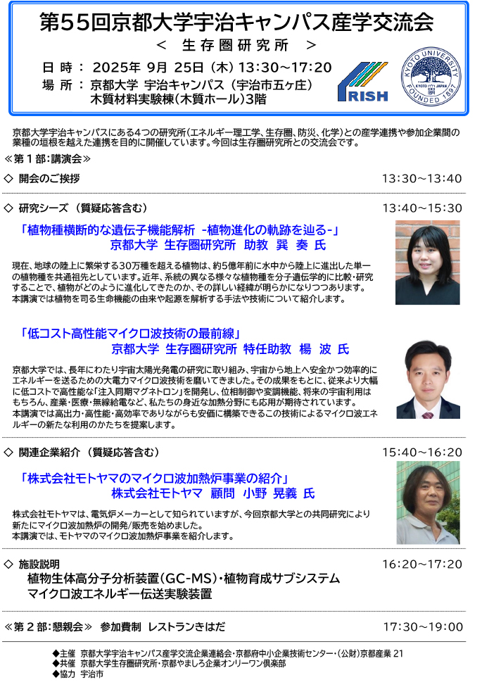 京都大学宇治キャンパスにある4つの研究所(エネルギー理工学、生存圏、防災、化学)との産学連携や参加企業間の業種の垣根を越えた連携を目的に開催されています。今回は生存圏研究所との交流会です。