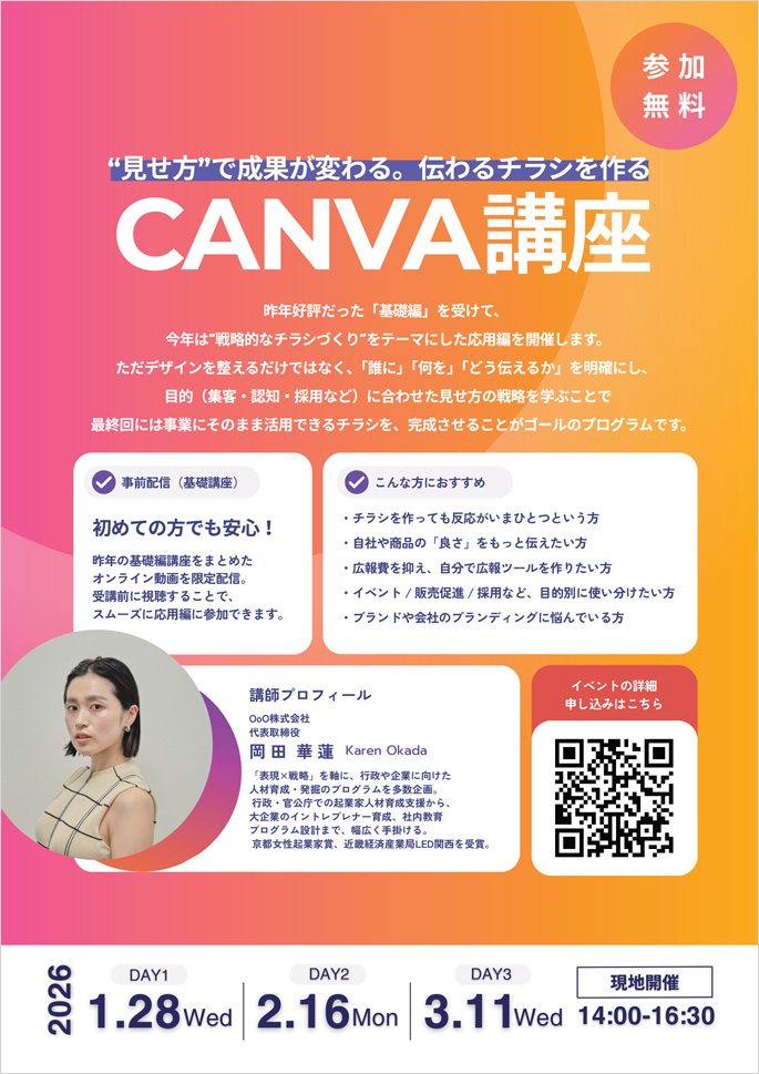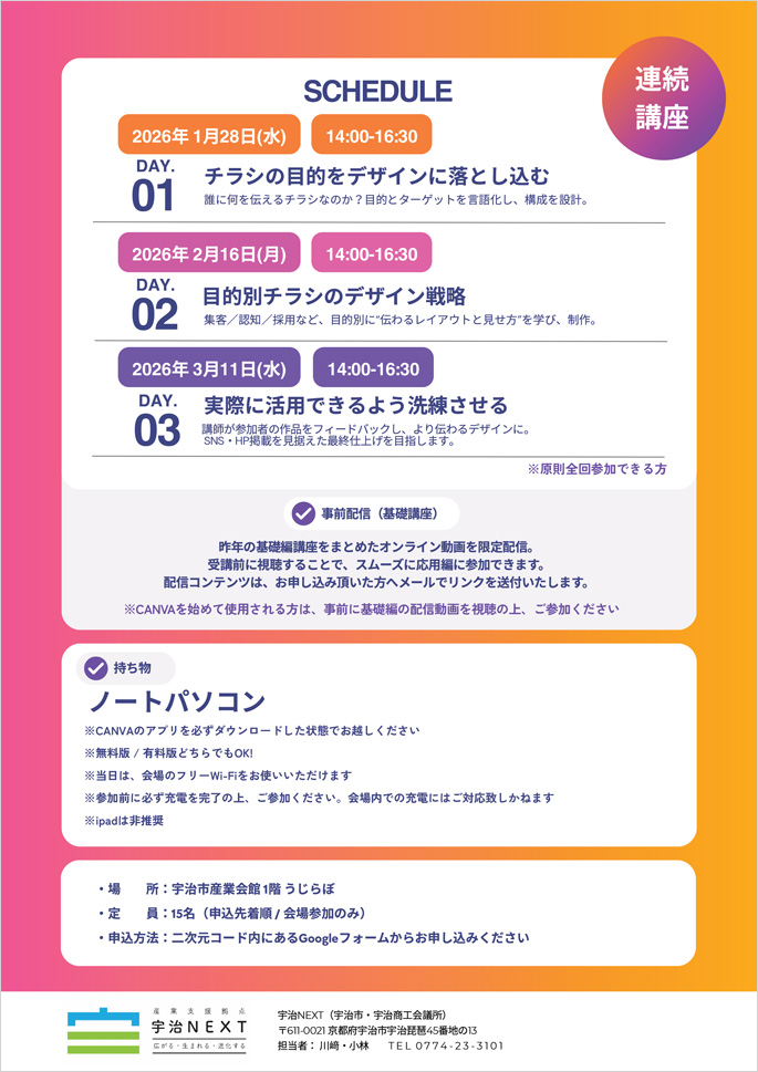 宇治NEXT(宇治市・宇治商工会議所)では、「CANVA講座 応用編」を開催します。「戦略的なチラシづくり」をテーマに「誰に」「何を」「どう伝えるか」を明確にしたチラシの作成を全3回通じて行います。この機会にぜひご参加ください!