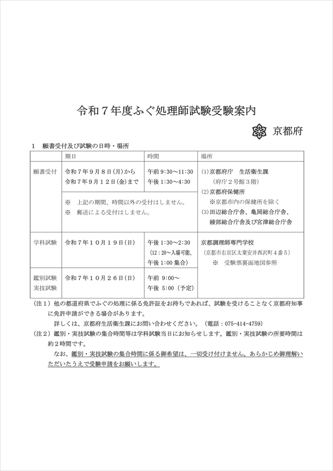京都府では、令和7年度京都府ふぐ処理師試験を実施されます。ご関心をお持ちの方は、この機会にぜひご受験ください。